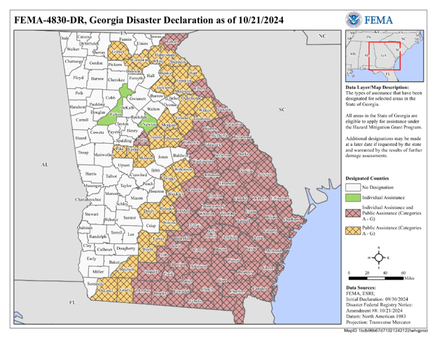The impact of Hurricane Helene has been devastating. As of October 21st, 2024, 91 Georgia counties have been declared by the President as federal disaster areas (DR-4830-GA) eligible for individual and/or public assistance (see Figure 1). Many timber owners in and near these areas have suffered significant timber losses. While full recovery will take time, there are some immediate actions timber owners can take to offset a portion of their losses. These include claiming timber casualty losses on federal income tax returns and conducting salvage timber sales.